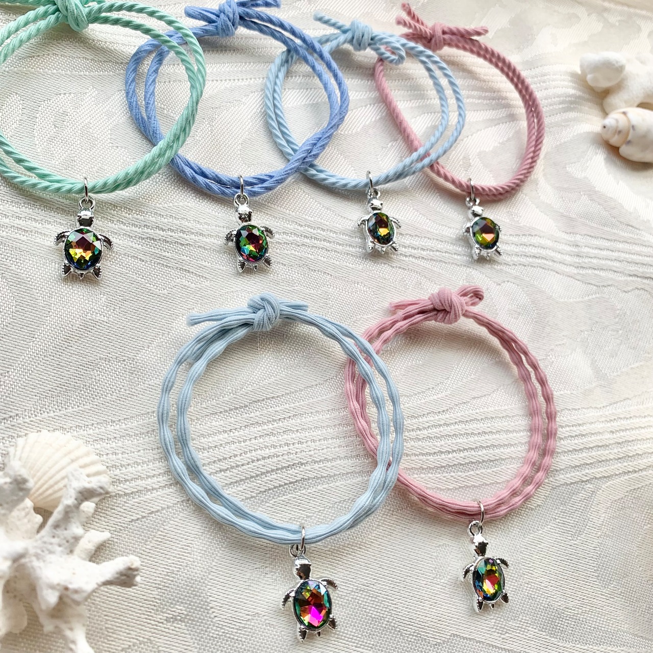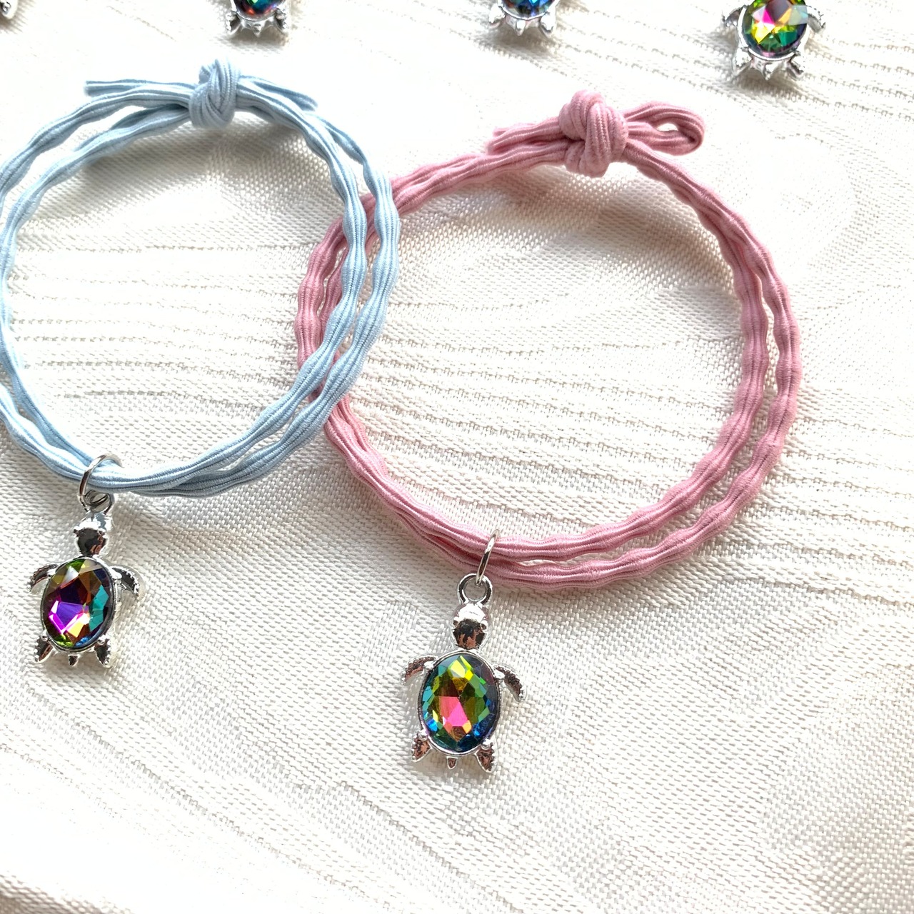 七色に輝く甲羅を背負ったウミガメのチャームが付いたヘアゴム。
